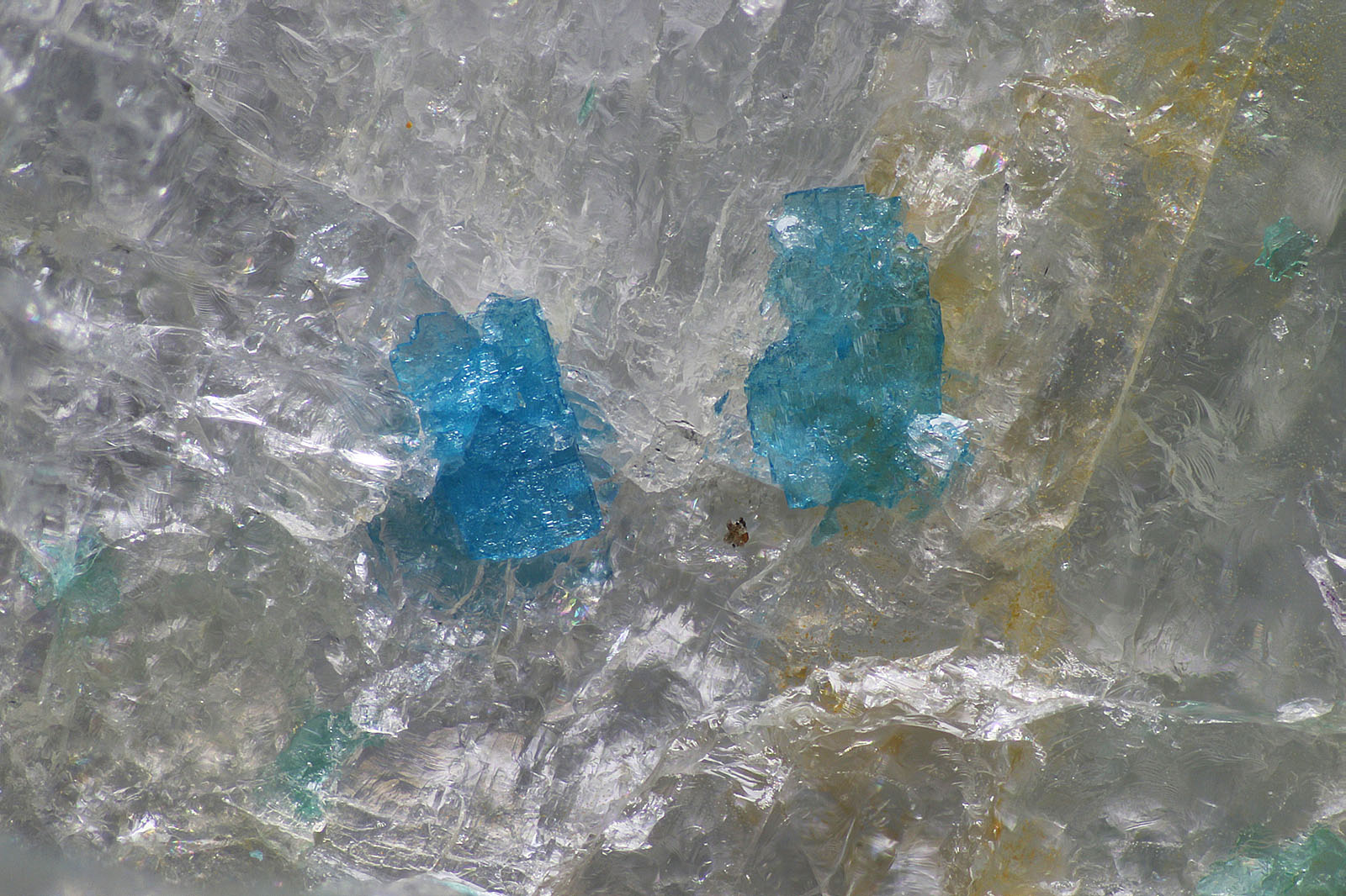 Dann schlug das Glück unbarmherzig zu. Es gelang mir einige wenige Micromounts dieses Minerals zu erwerben. Die Bröselchen, anders kann man das nicht nennen, zeigen auf Barytspaltflächen aufsitzende plattgedrückte hellblaue xx von max. 1/4mm Größe.
