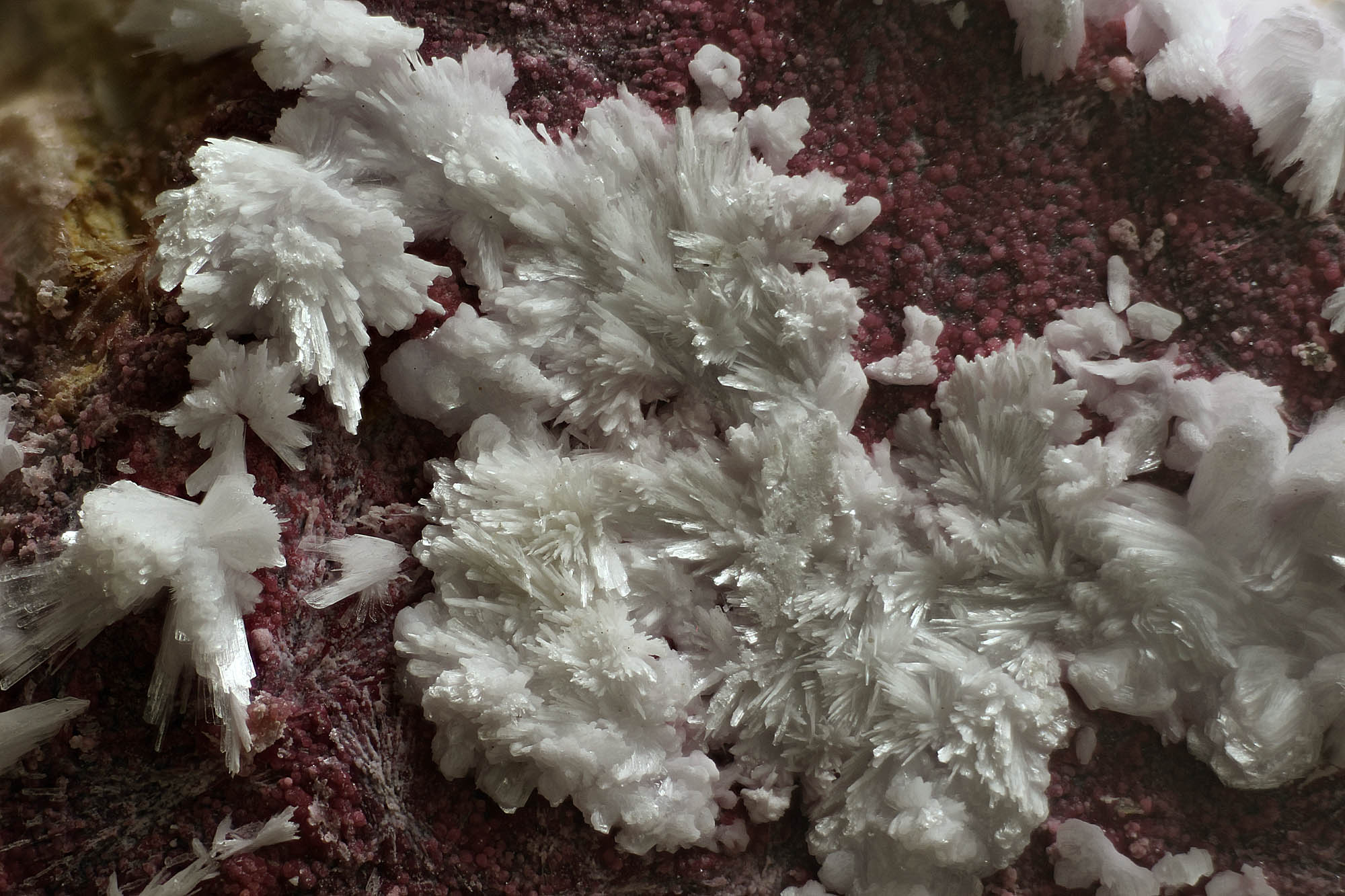 Typisches Guerinit-Aggregat mit Pikropharmakolith (feinnadelig) und lattigen Guerinit-Aggregaten, Bildbreite ca. 4mm