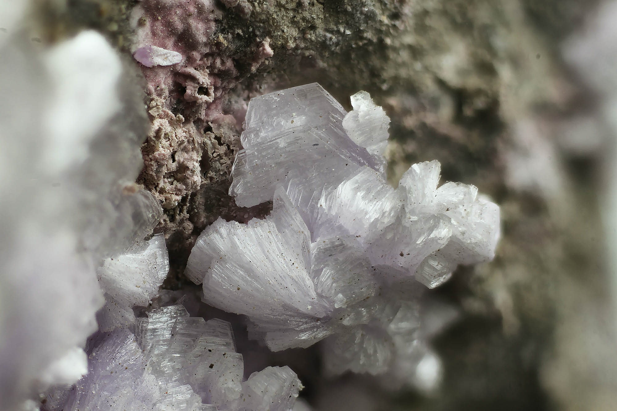 Zart fliederfarbene Aggregate aus sechsseitigen Blättchen, derart gefärbte Aggregate sind selten, Bildbreite ca. 6mm, Sammlung Döhnel-183