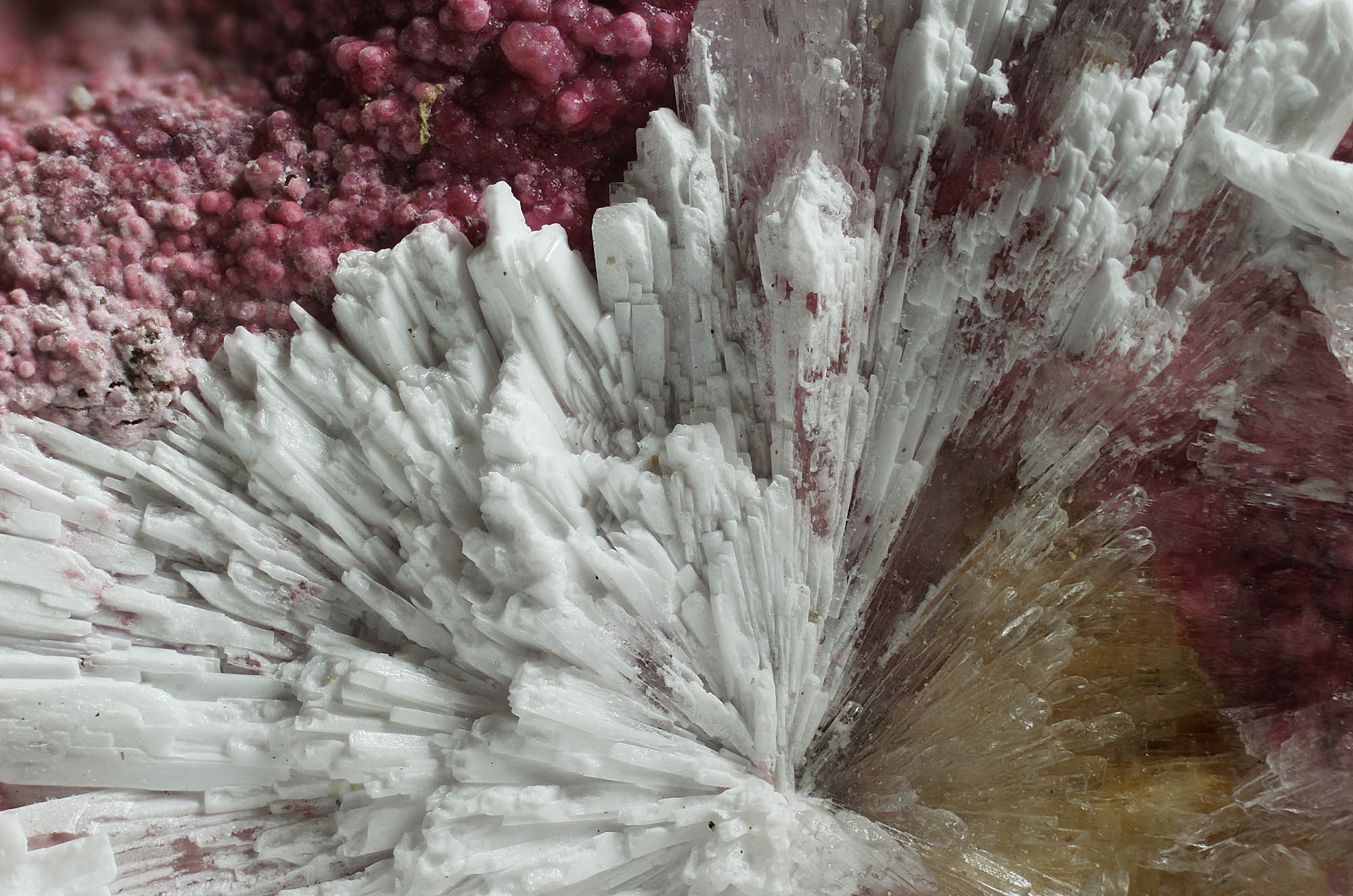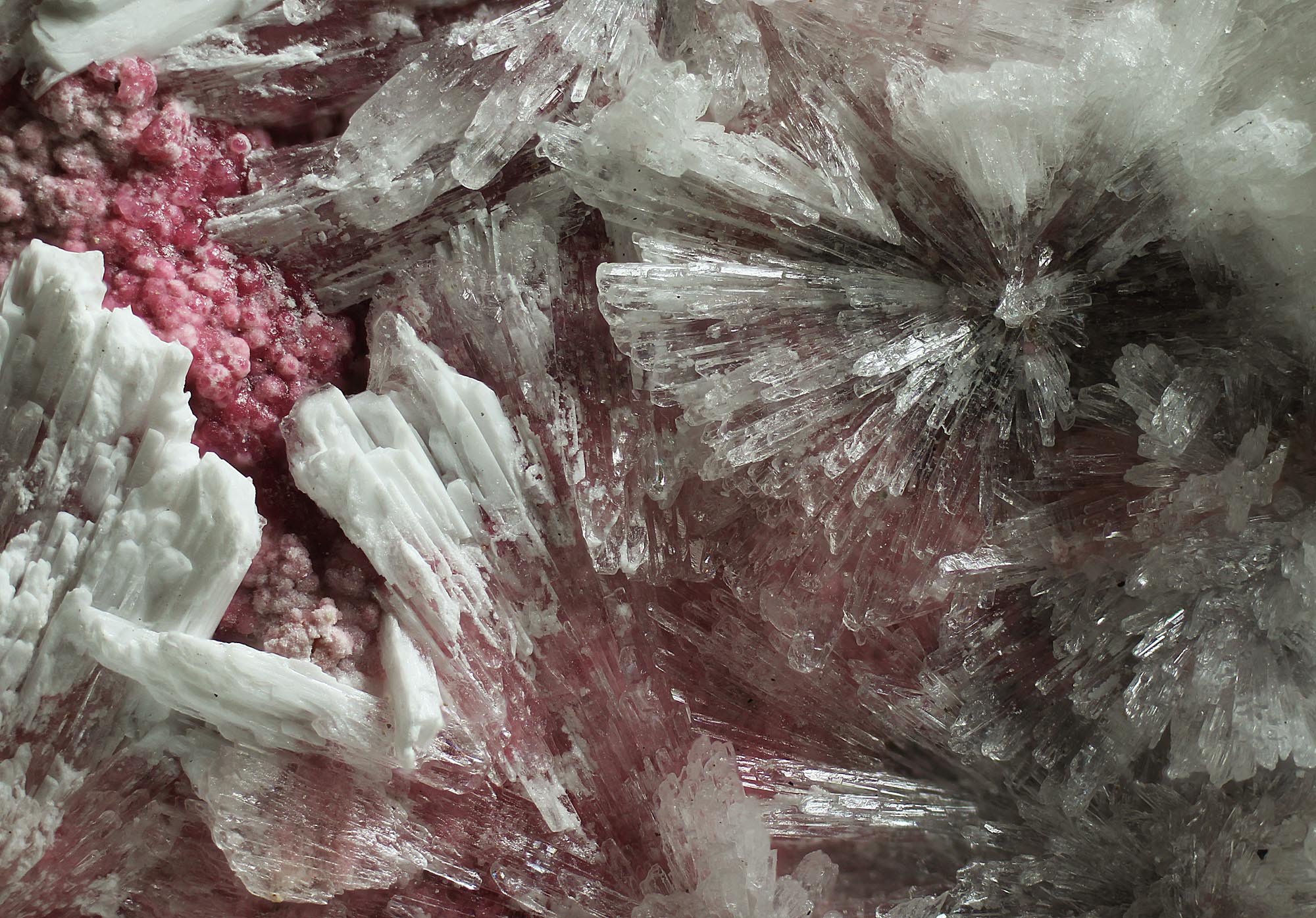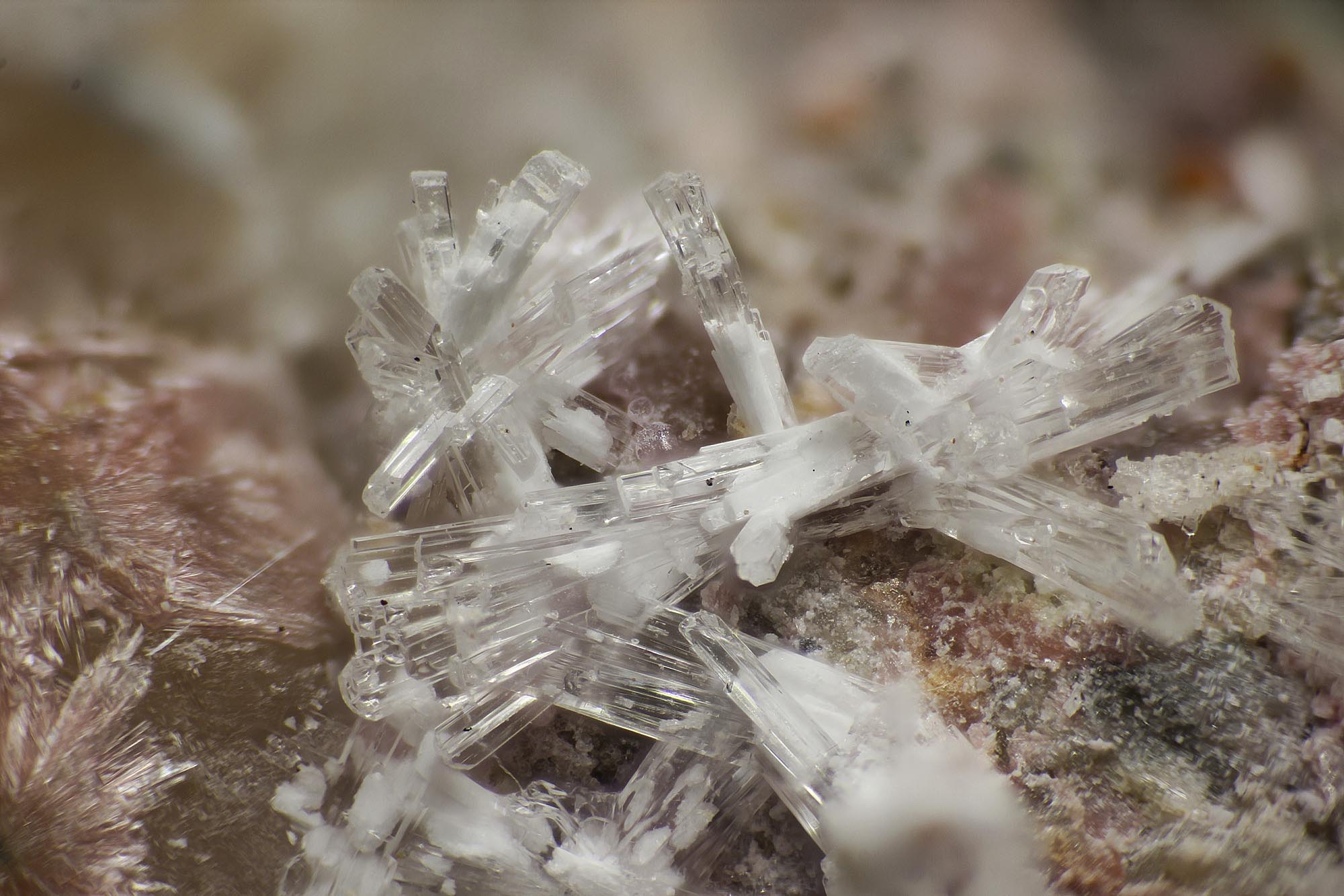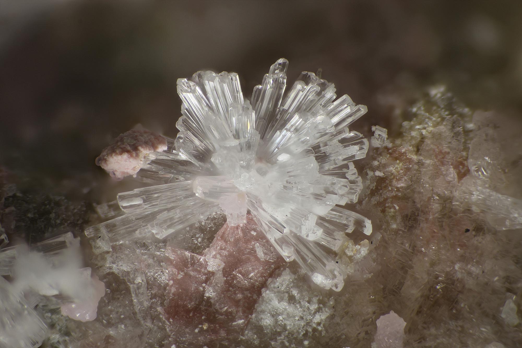 Gut zu erkennen die radialstrahligen farblosen klaren Sonnen des Pharmakolith, Bildbreite ca. 4mm, Sammlung Döhnel-104