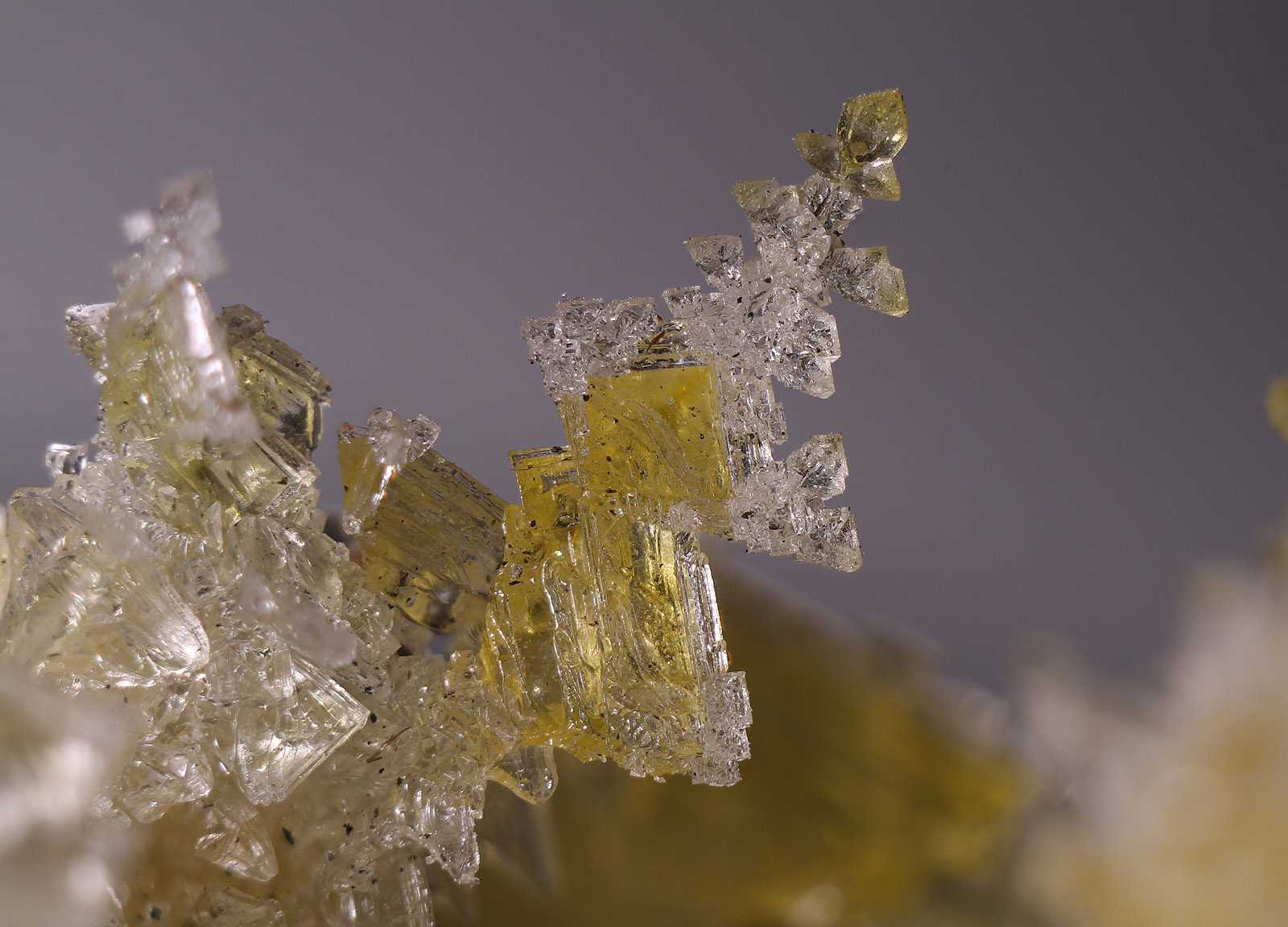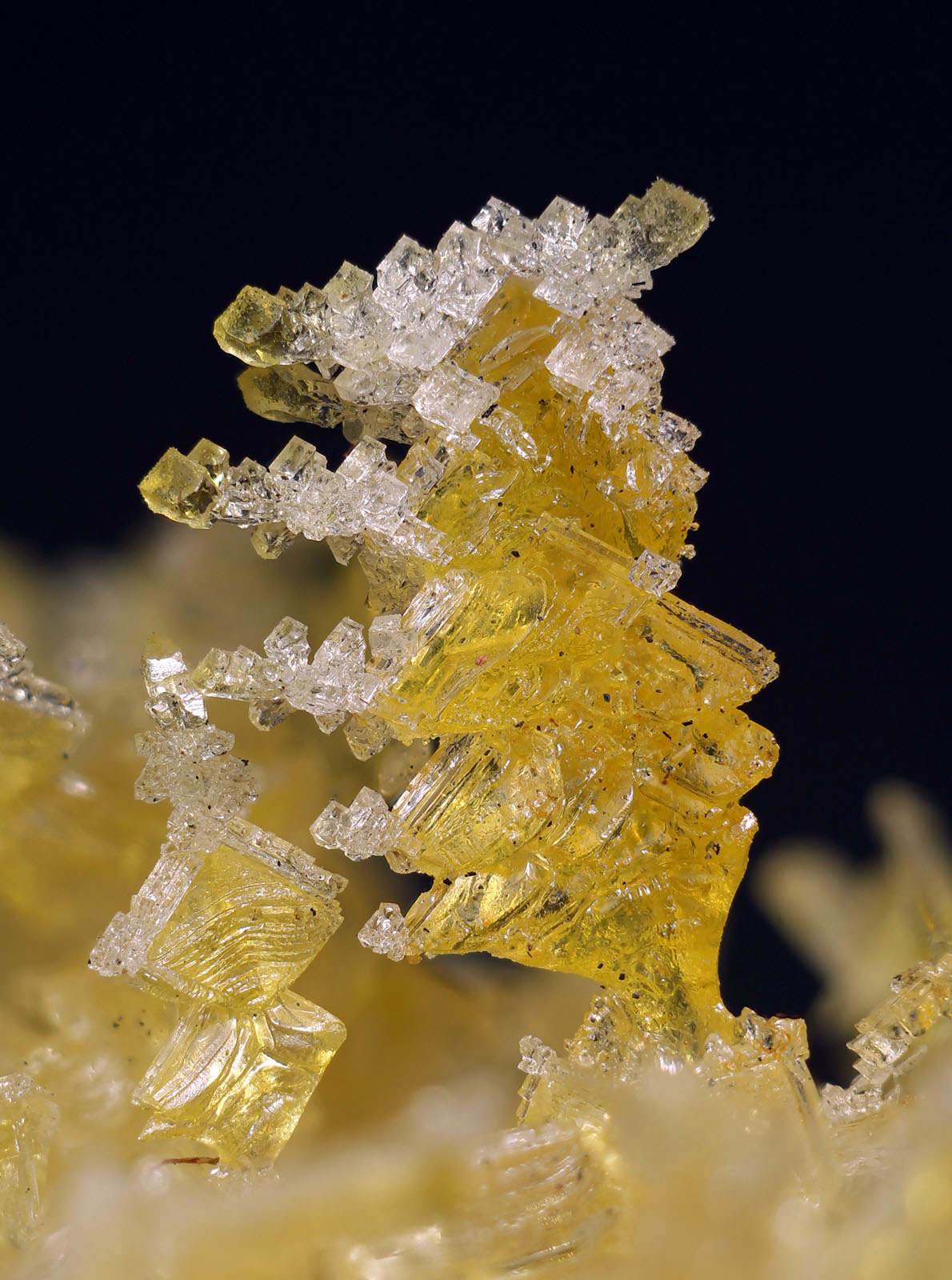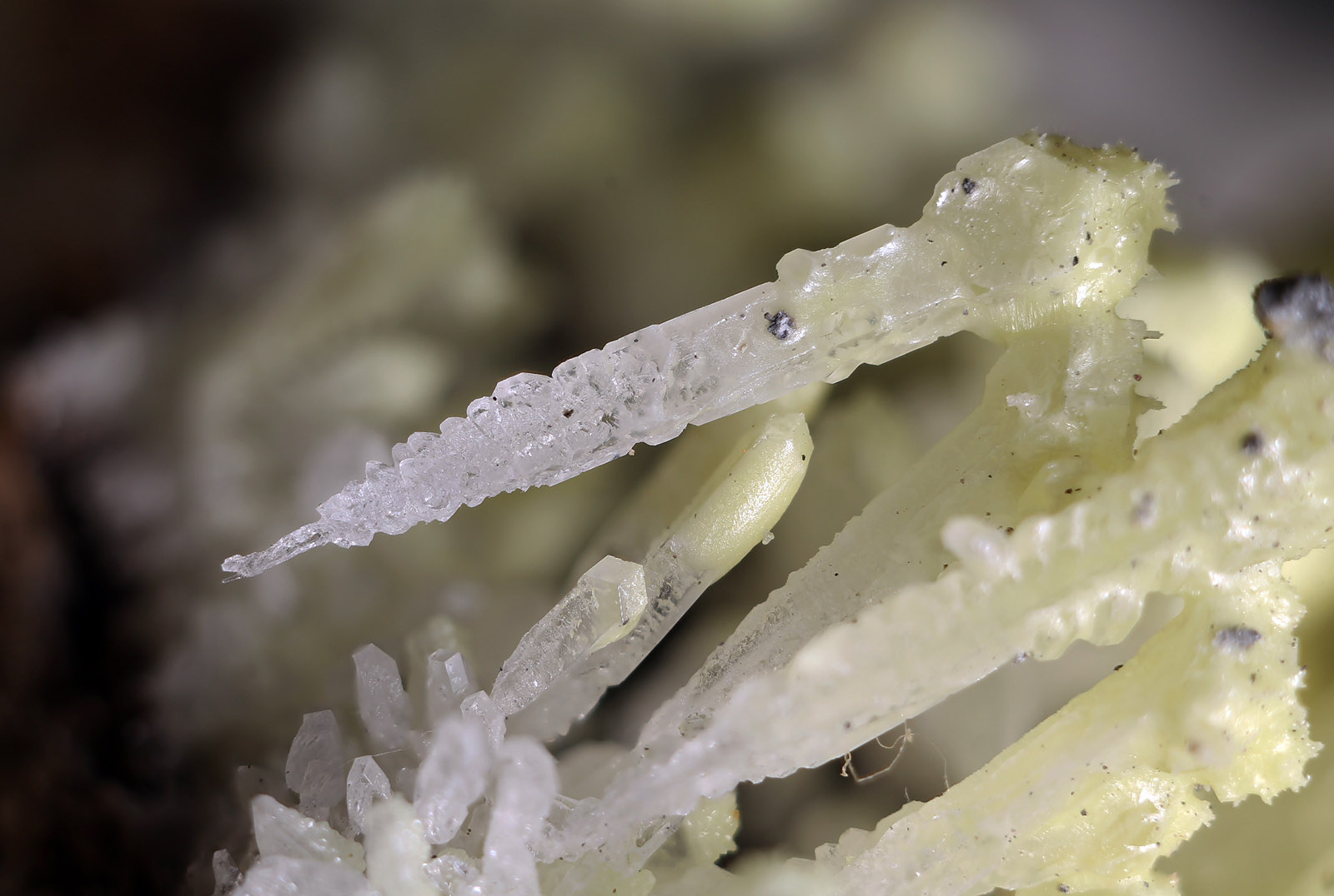 Die gelbe Farbe rührt mit hoher Warscheinlichkeit von Schwefeleinschlüssen her. Besonders gelbe trübe Salmiak-xx lassen darauf schließen. Warum einige Kristalle trüb sind, und andere wiederum wasserklar, konnte nicht geklärt werden. Interessant ist aber die Beobachtung, das gerade die gelben xx zu einem Längenwachstum neigen bzw. tannenbäumchenartige Aggregate bilden .
