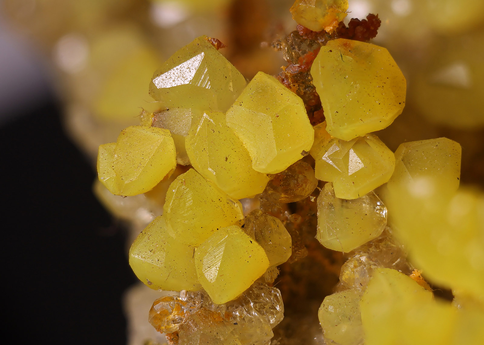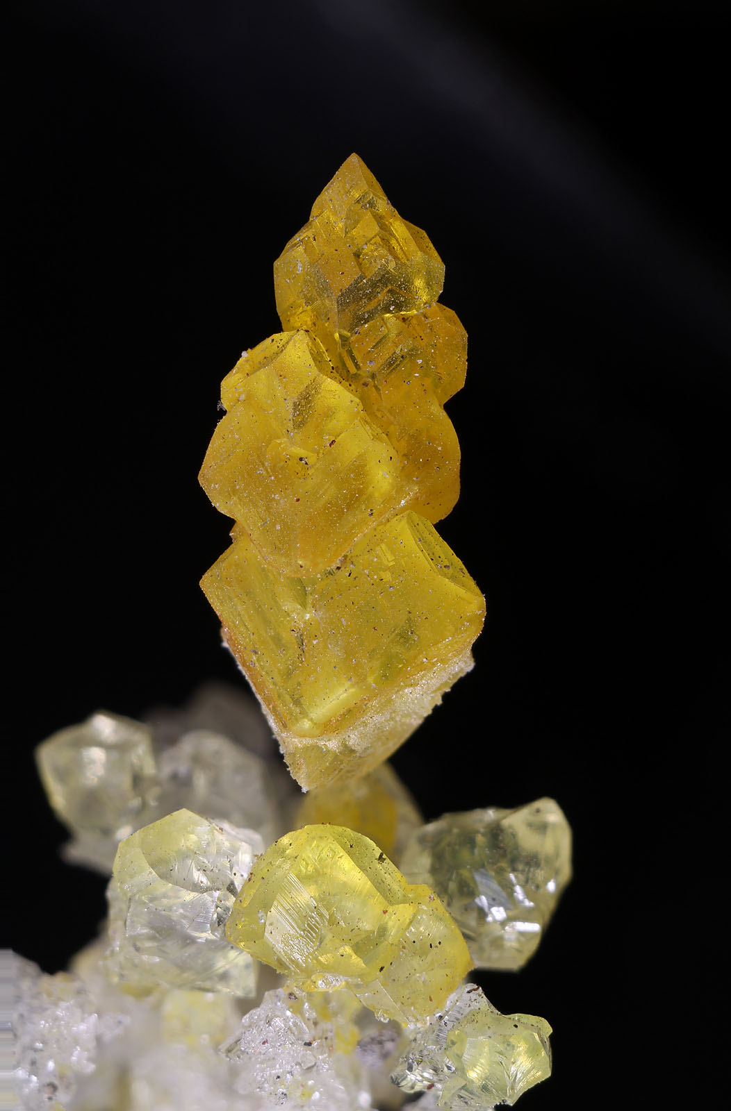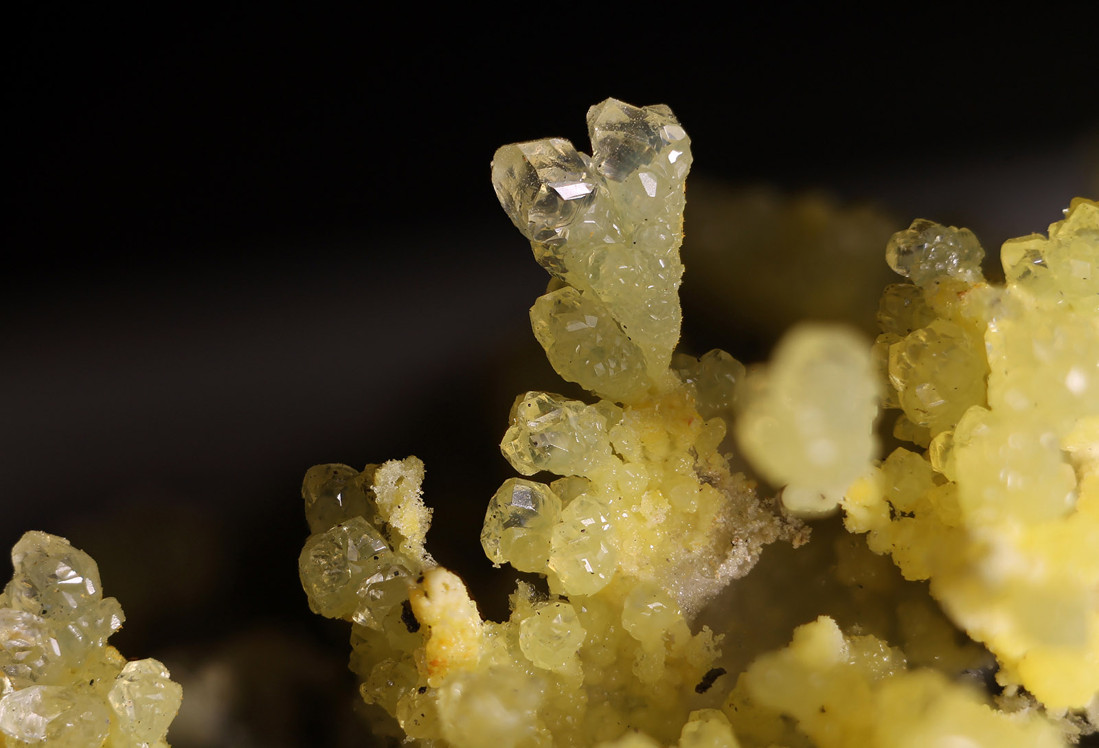 Die gelbe Farbe rührt mit hoher Warscheinlichkeit von Schwefeleinschlüssen her. Besonders gelbe trübe Salmiak-xx lassen darauf schließen. Warum einige Kristalle trüb sind, und andere wiederum wasserklar, konnte nicht geklärt werden. Interessant ist aber die Beobachtung, das gerade die gelben xx zu einem Längenwachstum neigen bzw. tannenbäumchenartige Aggregate bilden .