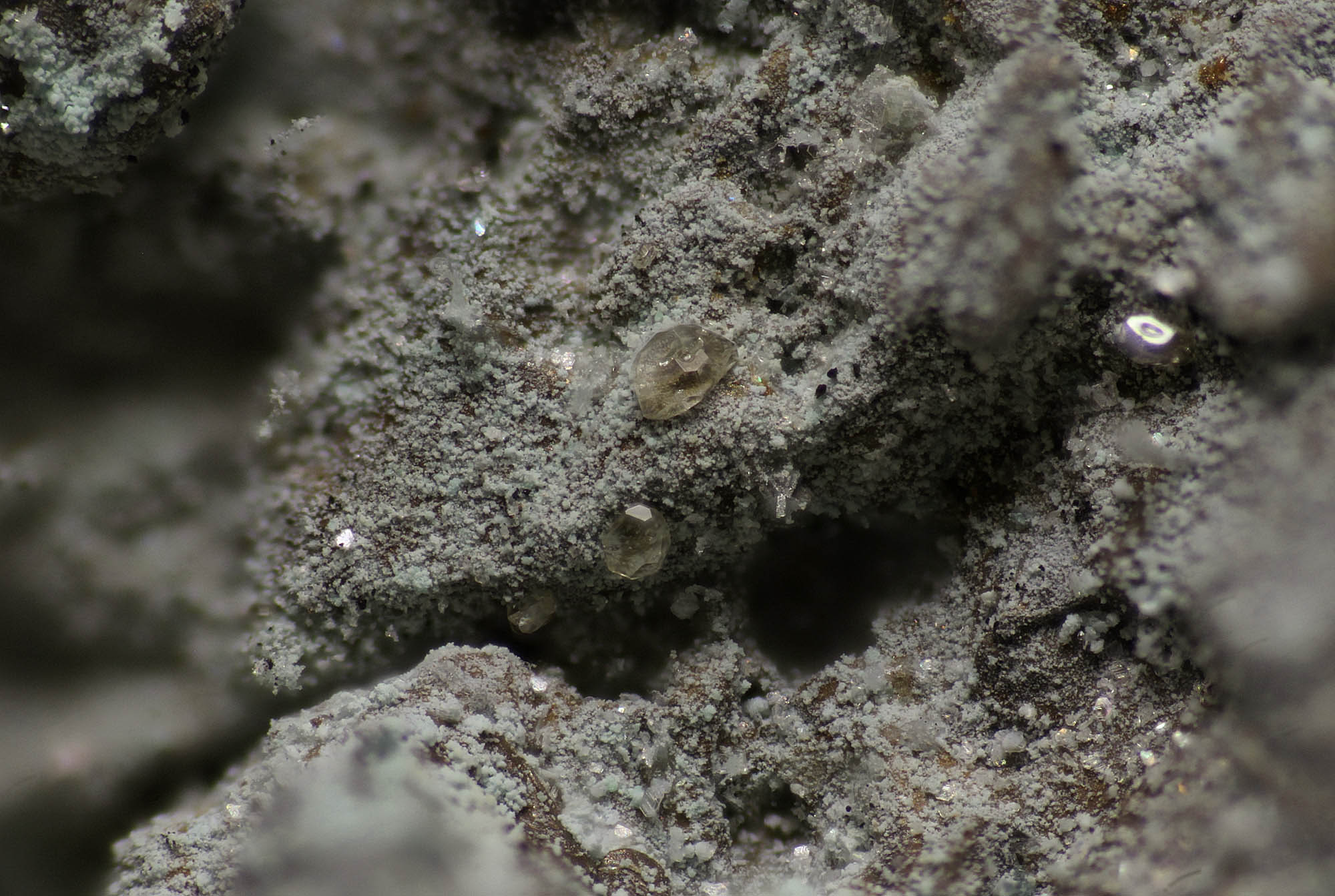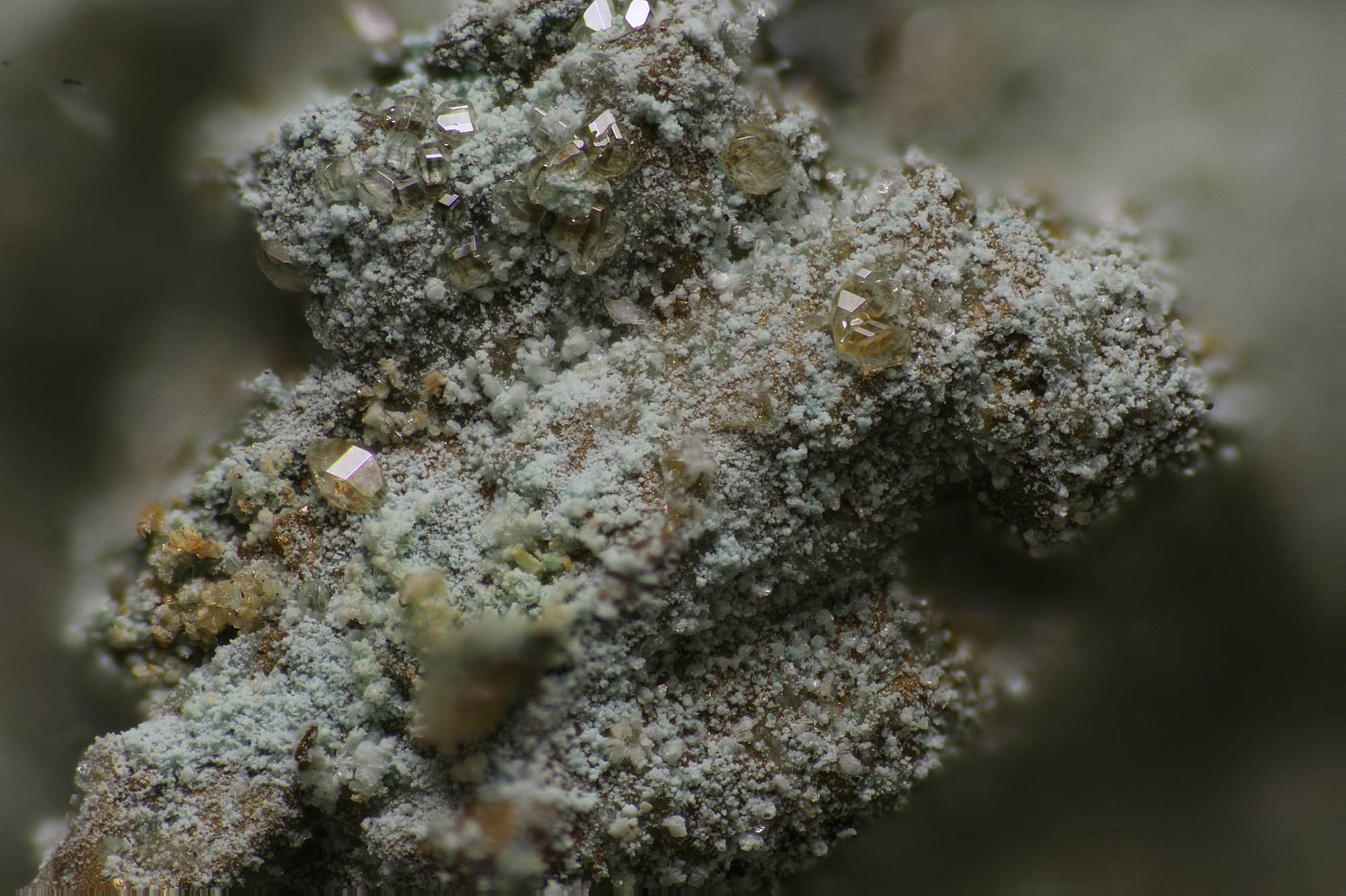 beise Bilder zeigen die winzigen xx auf korrodiertem Chalkopyrit, die bläuliche Kruste ist Chalkanthit, der z.T entwässert ist.