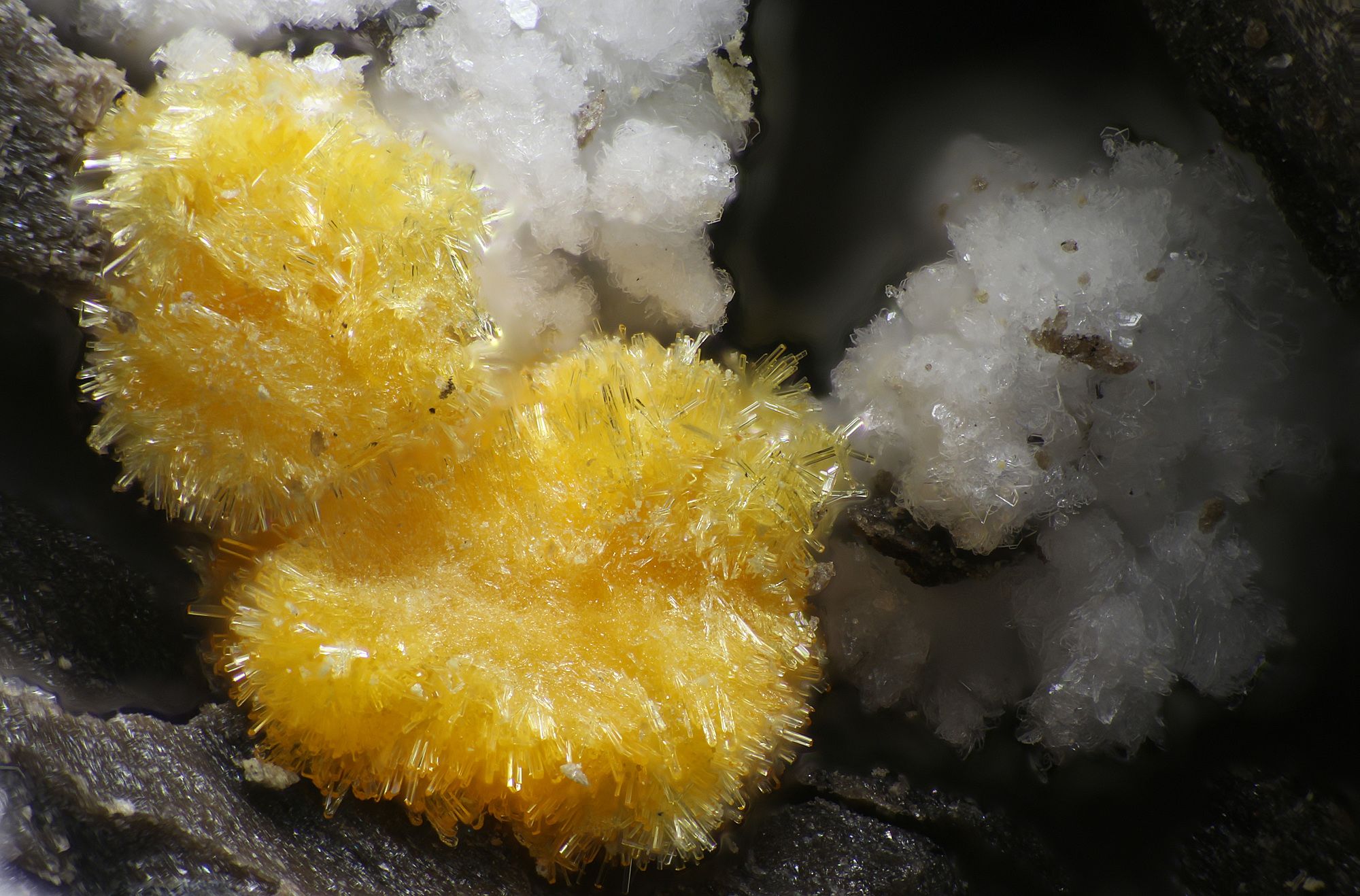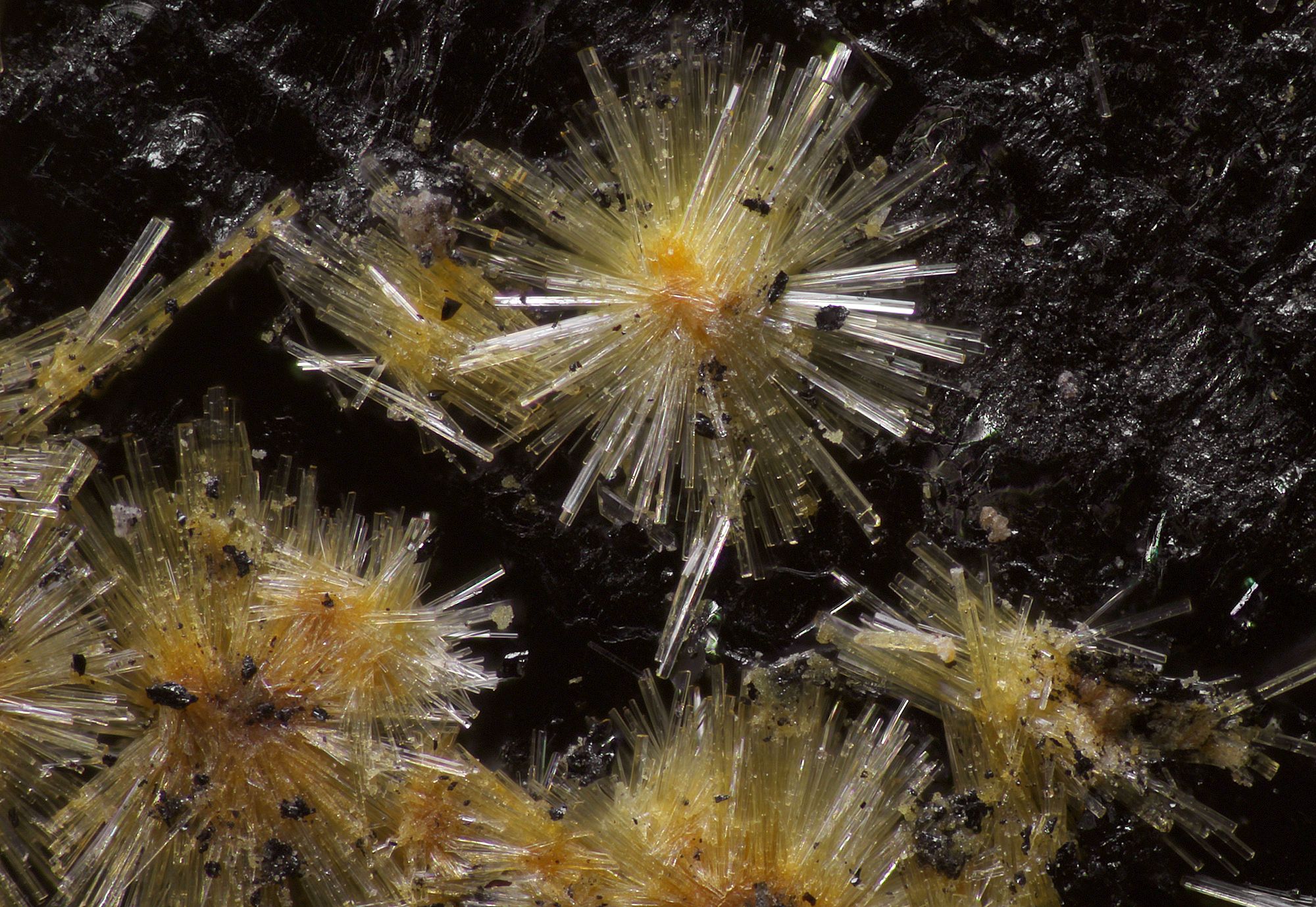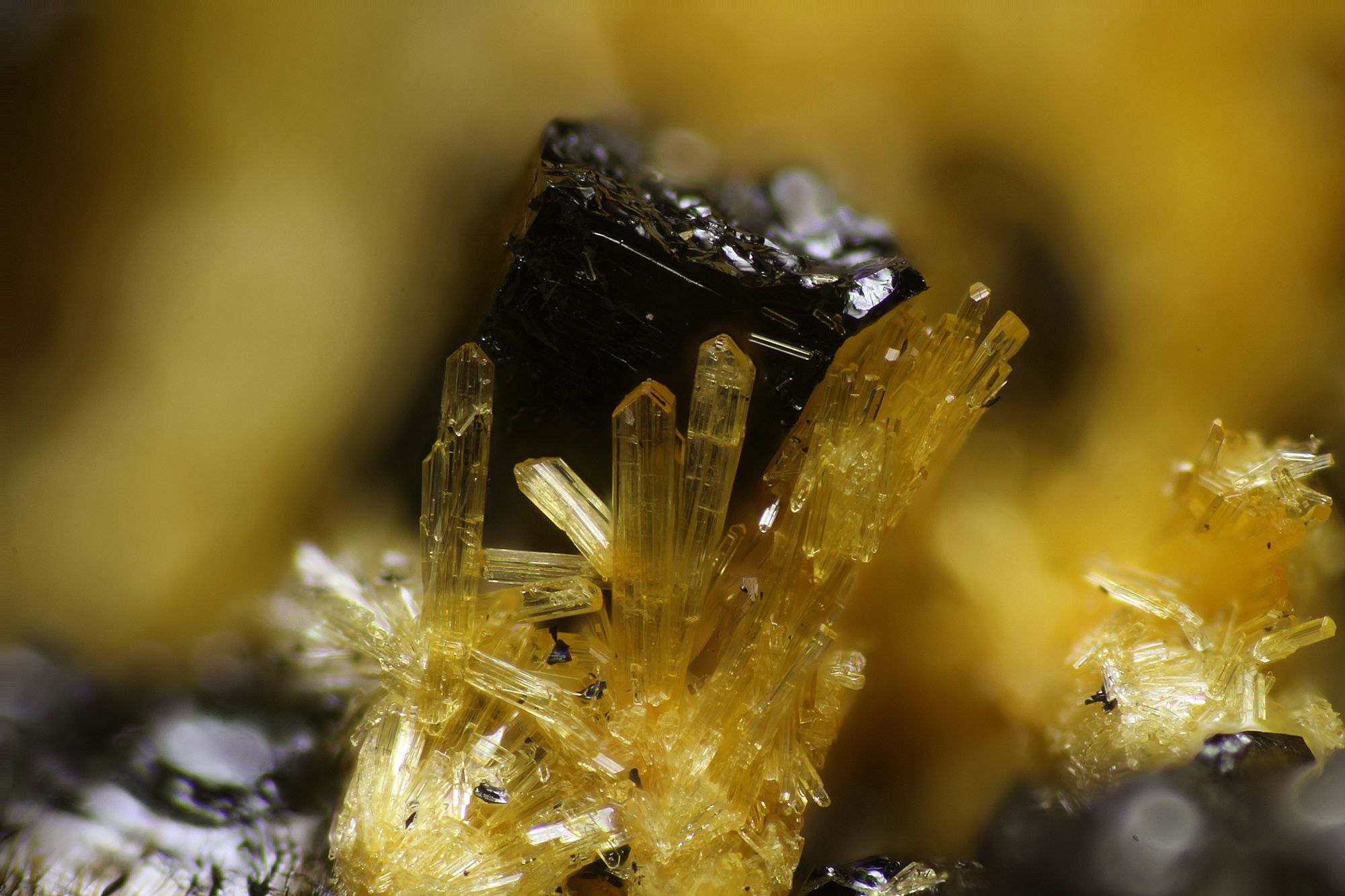 Wer sie je gesehen hat weis warum alle nach dem Sideronatrit so verückt sind. Sideronatrit bildet in einigen Vorkommen der Verwitterung von Pyrit u/o Markasit gelbe bis goldgelbe Nädelchen und prismatische xx. In aller Regel sind diese xx zu igelartigen Gruppen von bis zu mehreren Millimetern Größe verwachsen. In weniger häufigen Fällen kann man aber auch prismatische oder kurztafelige xx beobachten, die dabei gerne einmal eine Größe um 1mm erreichen. Diese xx sind dann oft klar und zeigen eine tolle Flächenvielfalt.