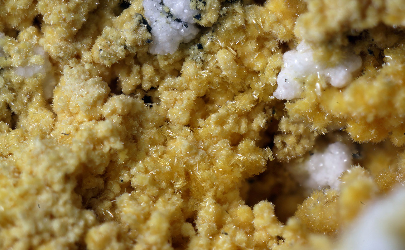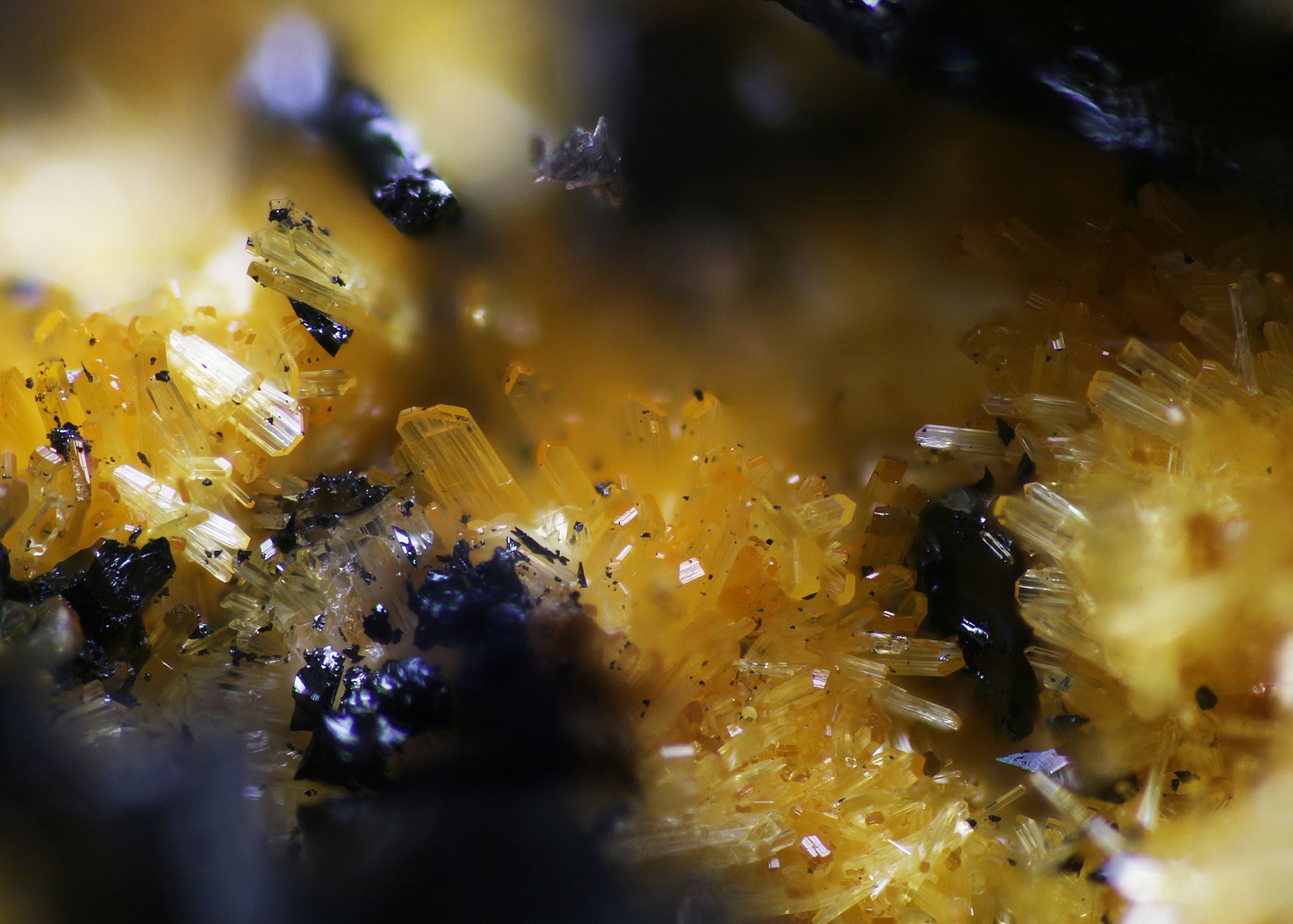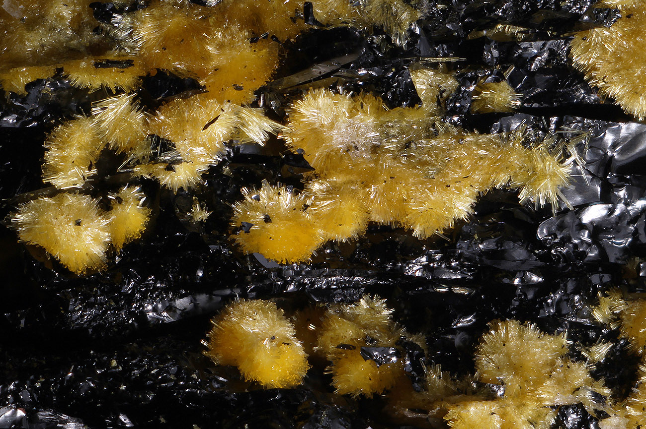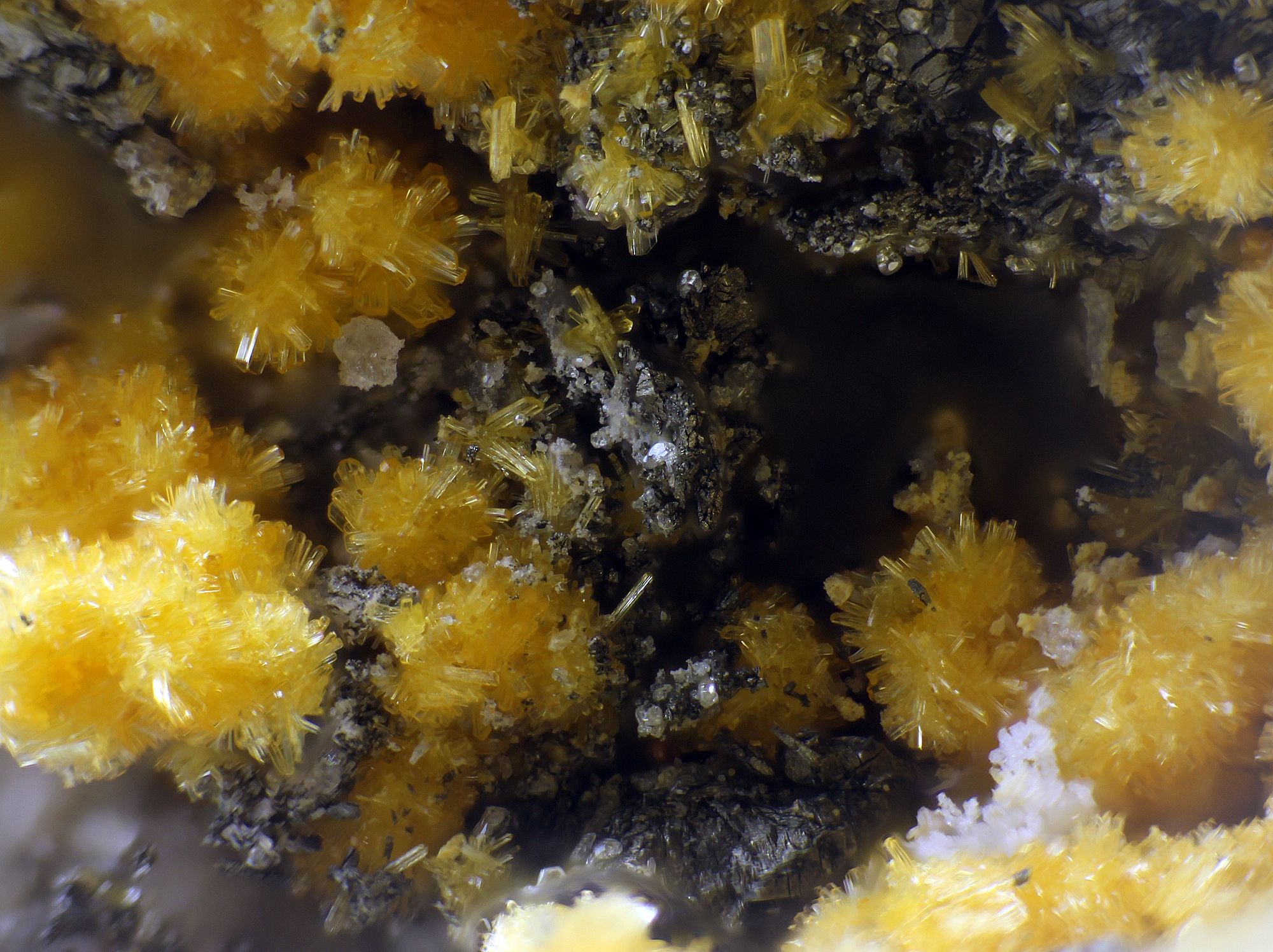 Wer sie je gesehen hat weis warum alle nach dem Sideronatrit so verückt sind. Sideronatrit bildet in einigen Vorkommen der Verwitterung von Pyrit u/o Markasit gelbe bis goldgelbe Nädelchen und prismatische xx. In aller Regel sind diese xx zu igelartigen Gruppen von bis zu mehreren Millimetern Größe verwachsen. In weniger häufigen Fällen kann man aber auch prismatische oder kurztafelige xx beobachten, die dabei gerne einmal eine Größe um 1mm erreichen. Diese xx sind dann oft klar und zeigen eine tolle Flächenvielfalt.