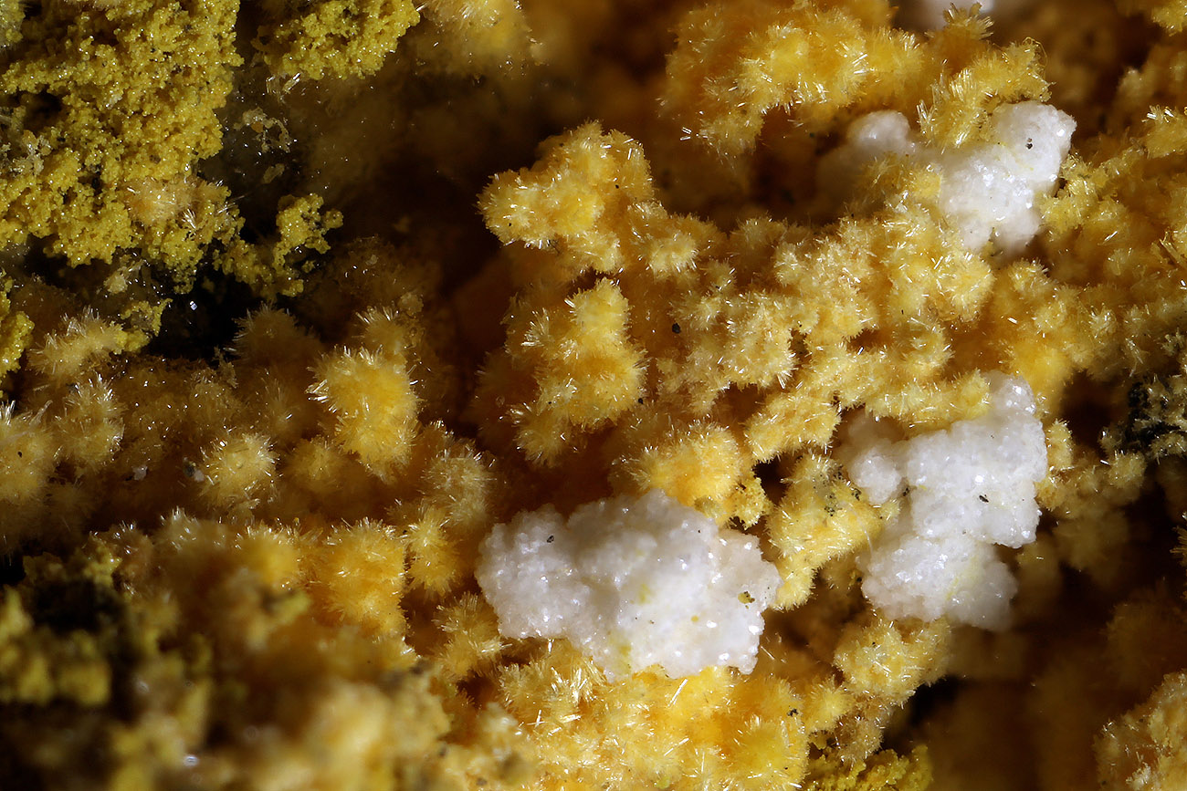 Das häufigste Begleitmineral von Sideronatrit ist der Tamarurgit mit seinen weißen blättrigen Aggregaten.