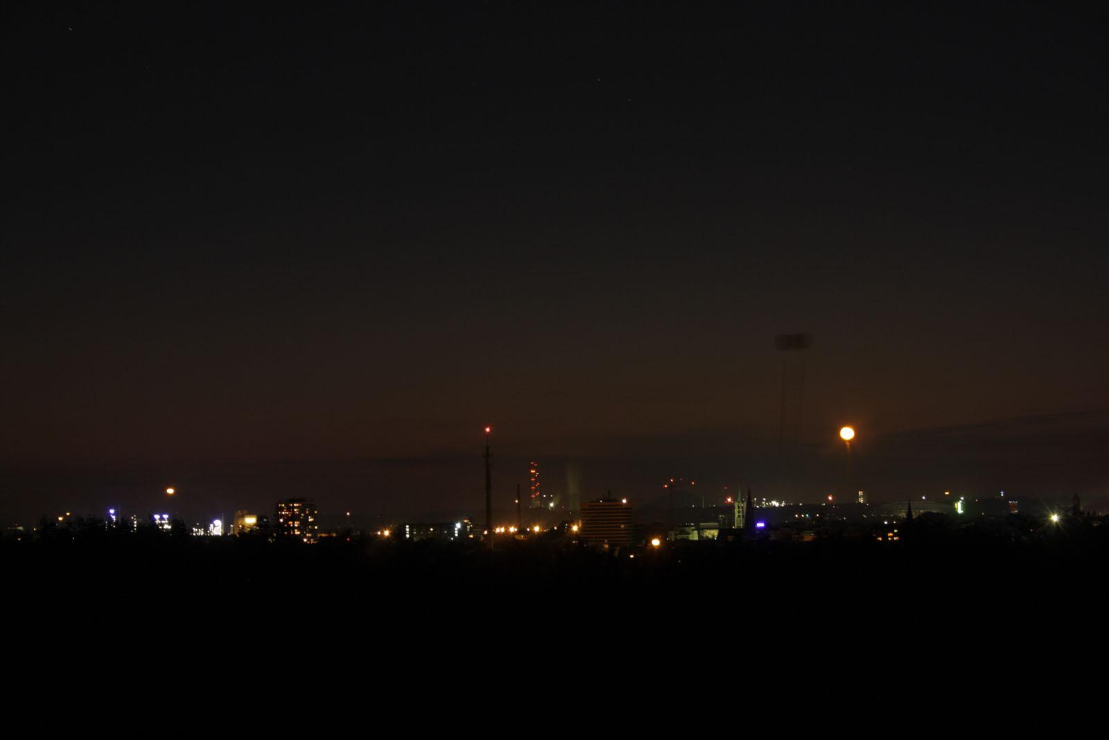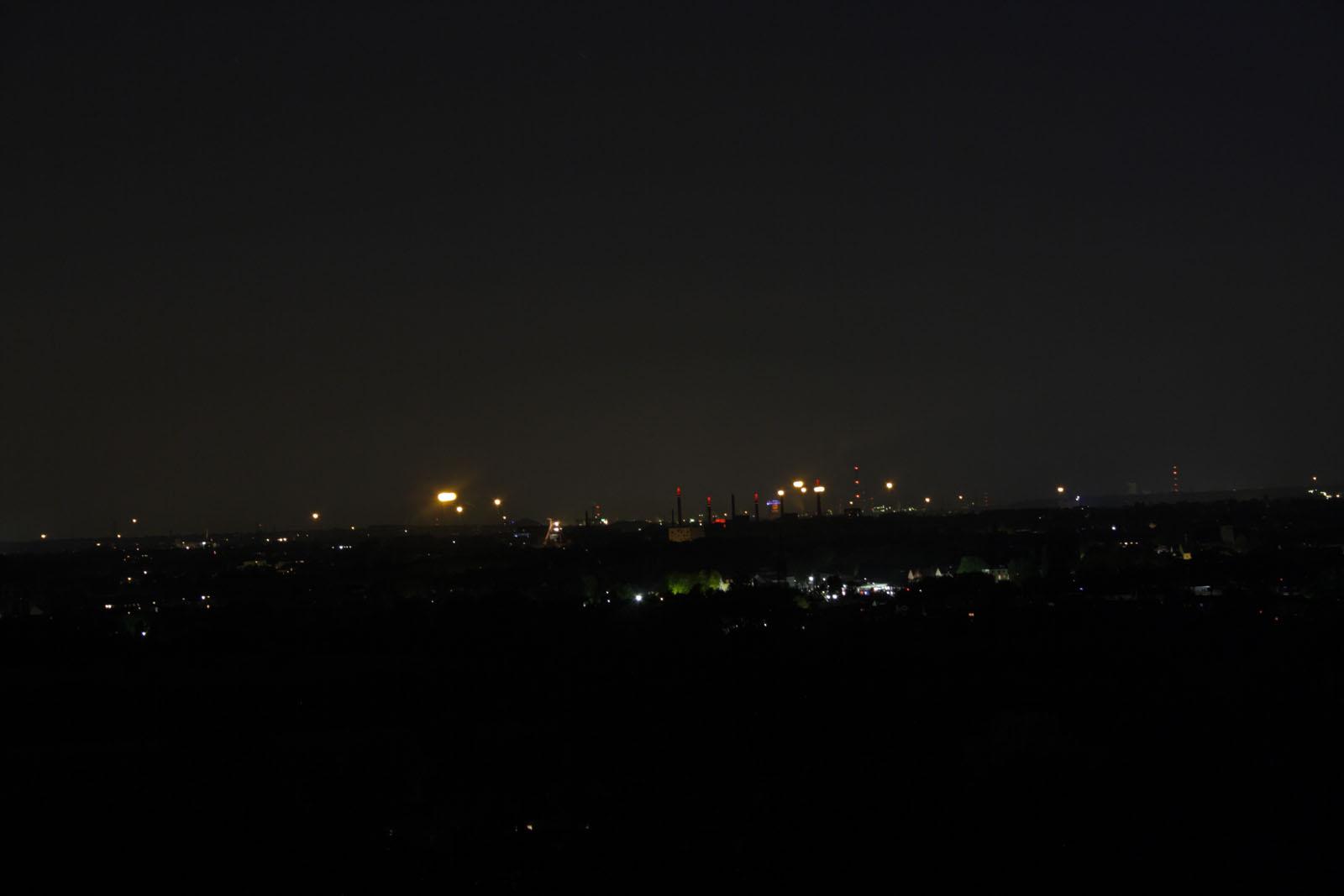 Blick vom Alpinzentrum in Bottrop mit Blick nach Norden, mäßger Wind. Die gelben eierförmigen Lichtkleckse oberhalb des Horizontes sind die Schachtzeichen. Einem Schachtzeichen ganz in der Nähe ist das Licht ausgegangen, es zappelt wie wild im Wind.